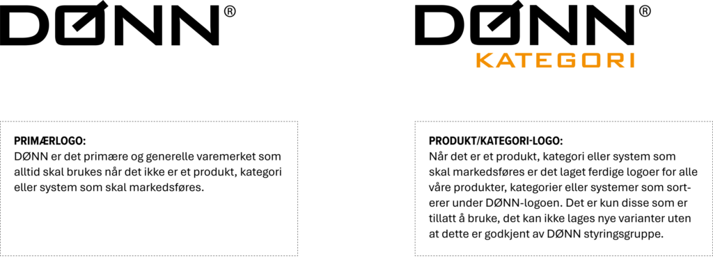 Primærlogoen DØNN skal brukes i alle sammenhenger der produksjonsselskapet generelt kommuniserer DØNN. I alle tilfeller hvor DØNN implementeres i profilen til produksjonsselskaper skal produksjons selskapet være avsender. Produkt/kategori-logo brukes på produkt, opplæring eller systemer.
